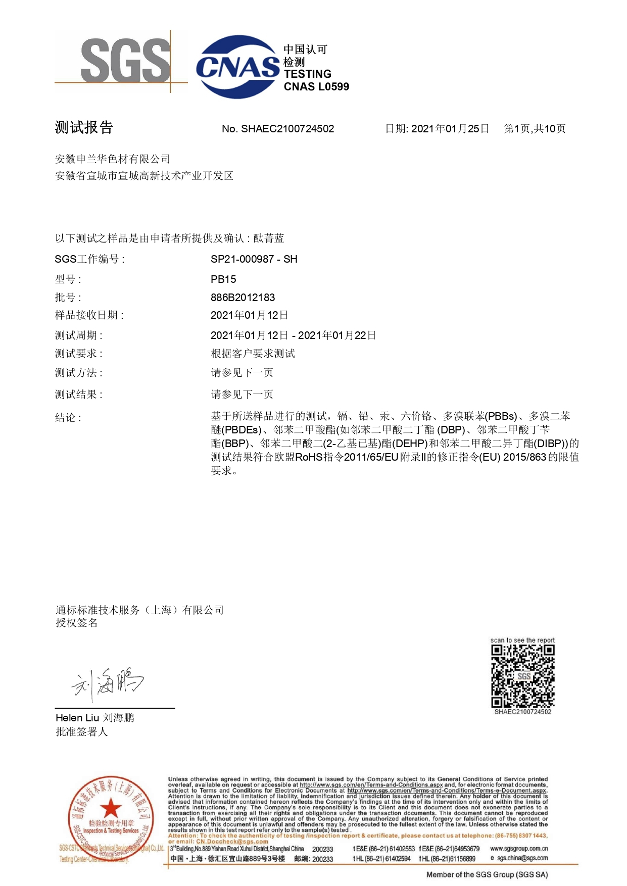 15:3產(chǎn)品SGS檢測報告