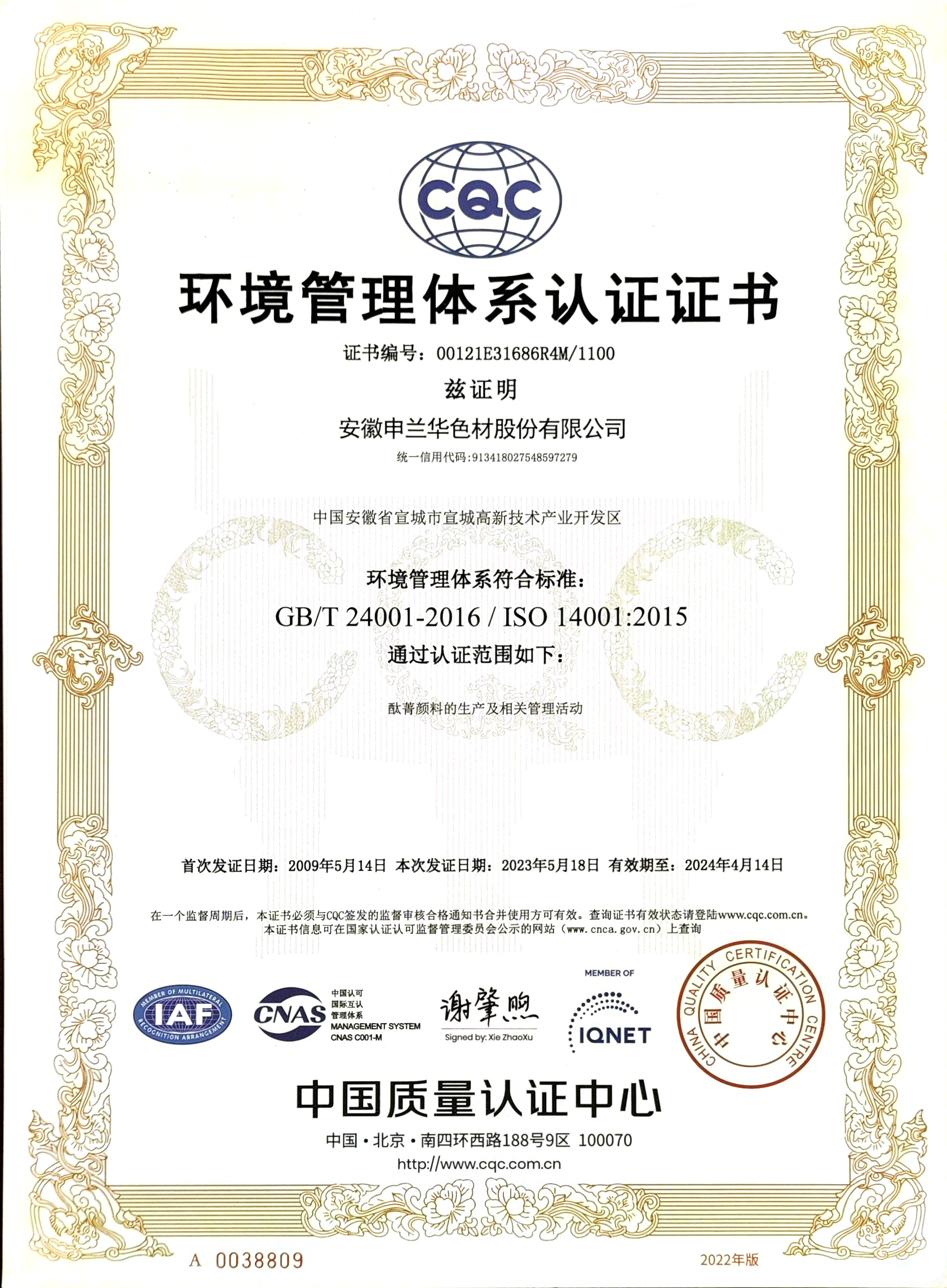 環(huán)境管理體系認(rèn)證證書(申蘭華股份)
