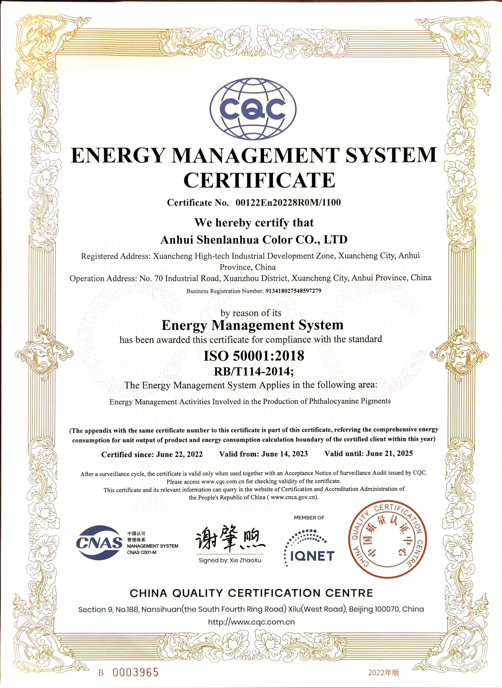 能源管理體系認(rèn)證證書(shū)英文版(申蘭華股份)